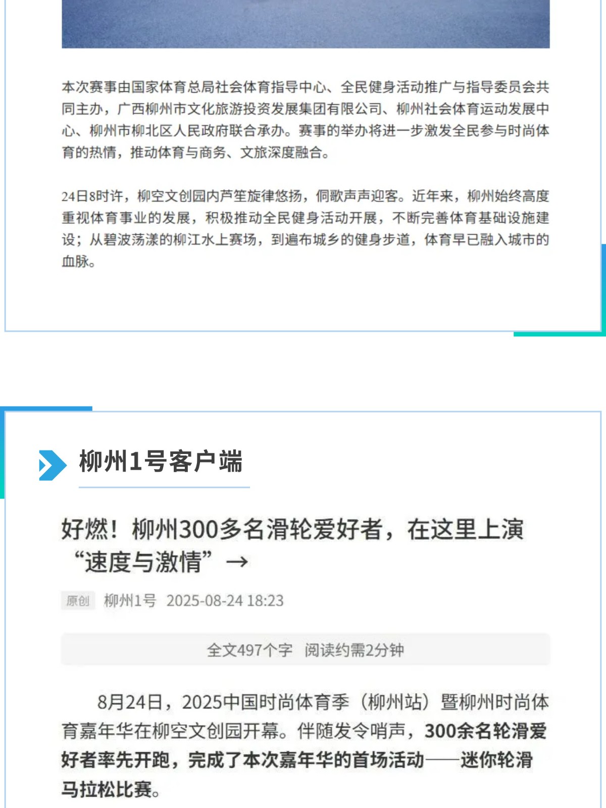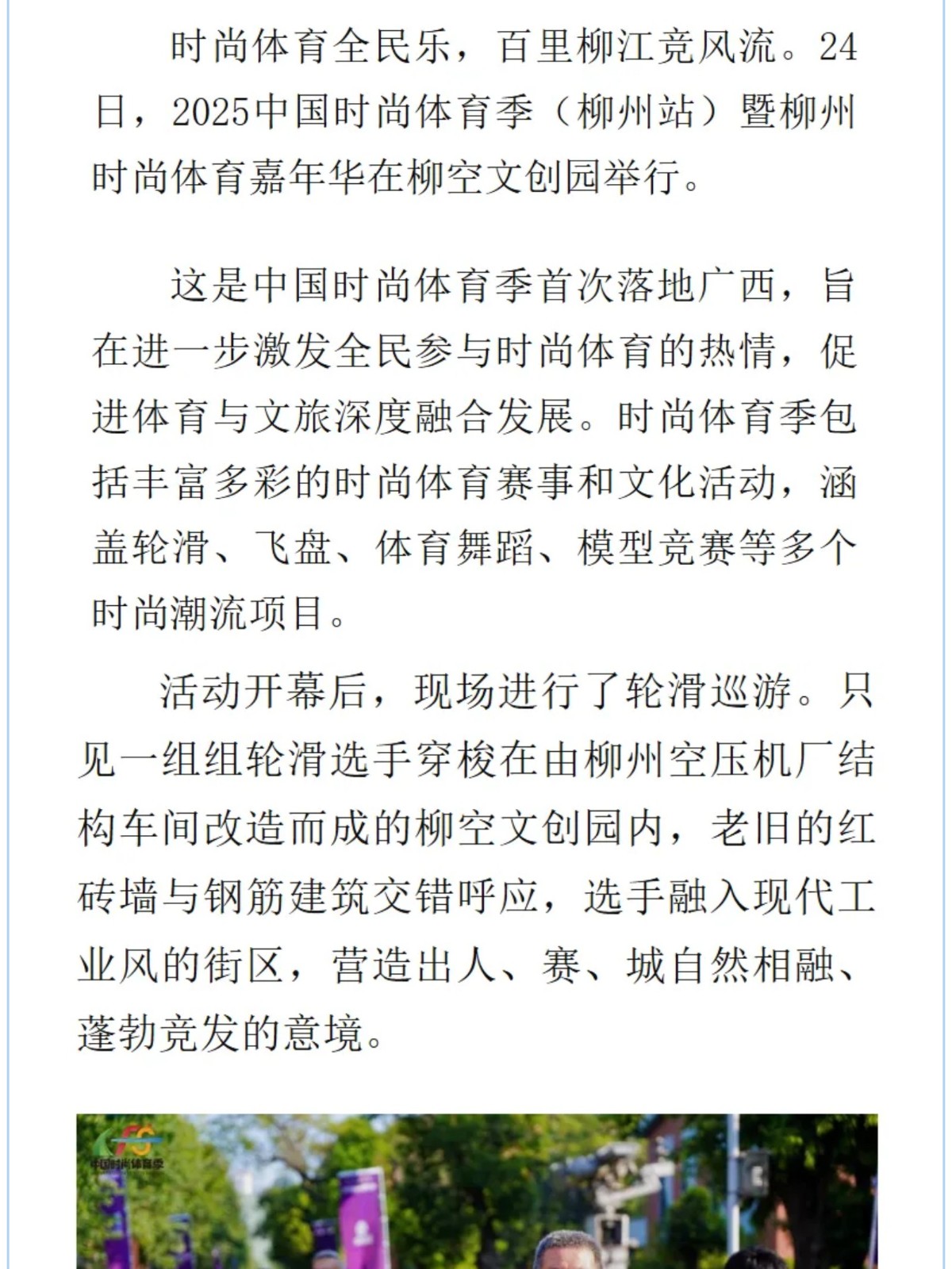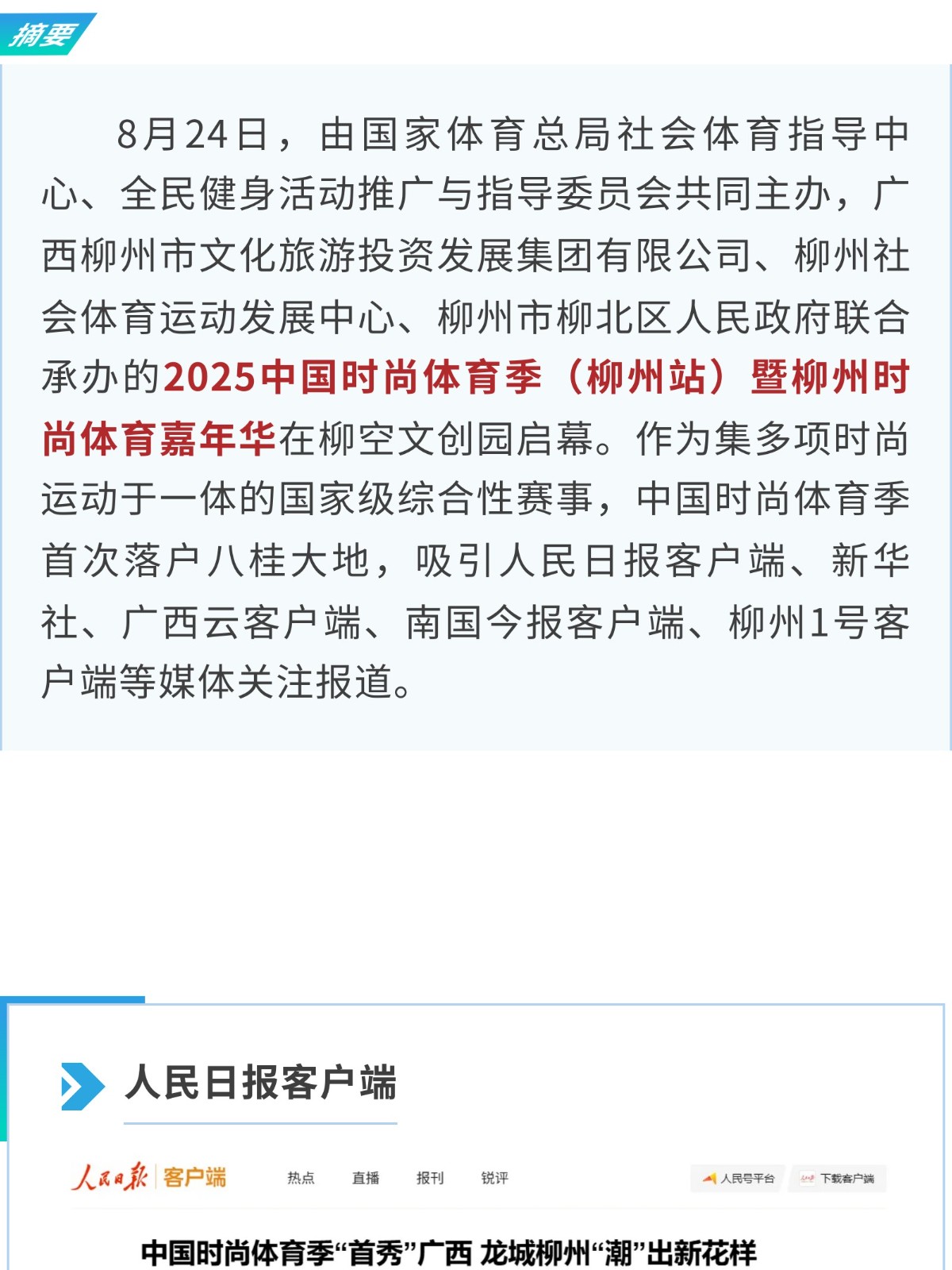 多家媒體關(guān)注:2025中國(guó)時(shí)尚體育季(柳州站)在柳空文創(chuàng)園啟動(dòng) 發(fā)布時(shí)間:2025年08月29日 17時(shí)來(lái)源:本站原創(chuàng)瀏覽:215 人次