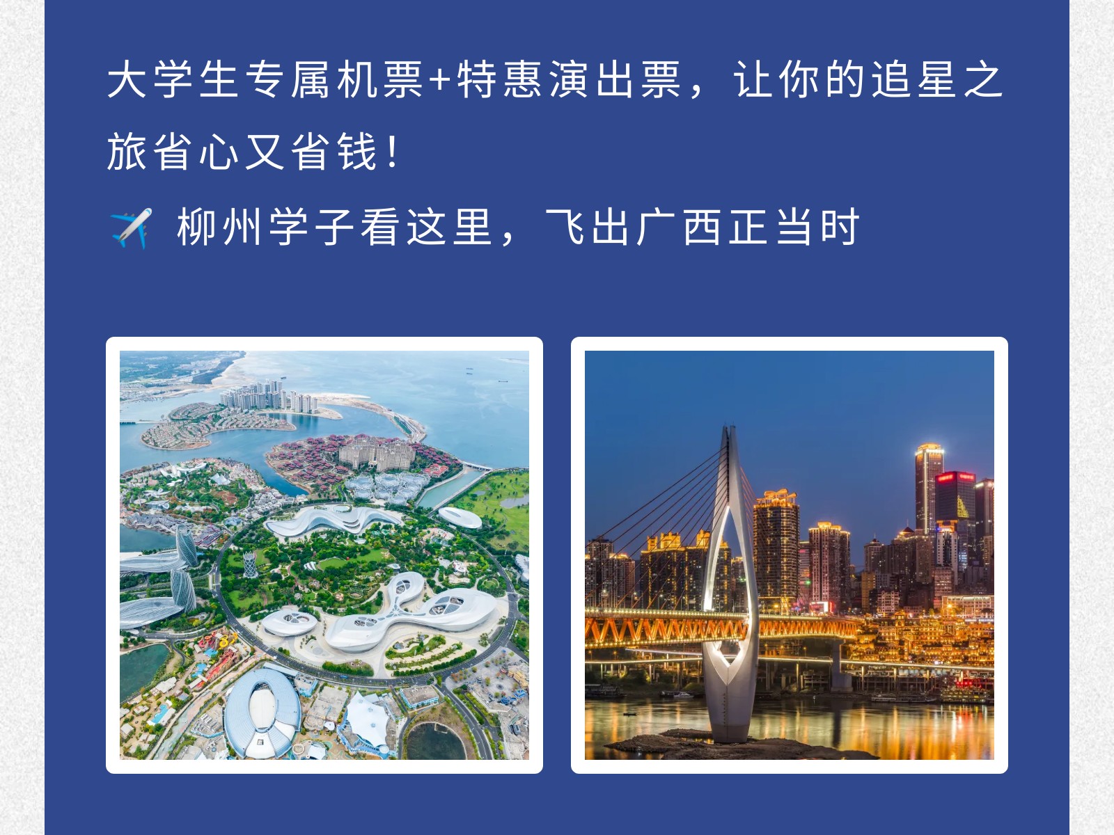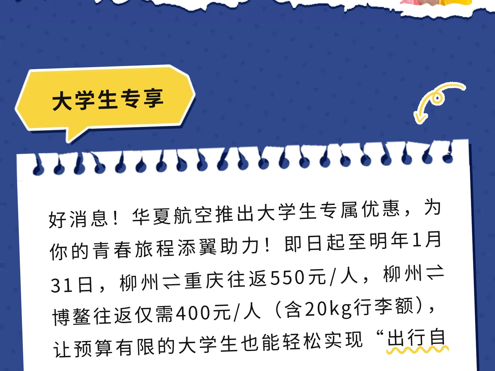【青春專線】柳州?重慶/博鰲大學(xué)生機(jī)票來襲!雙向奔赴正當(dāng)時(shí) 發(fā)布時(shí)間:2025年12月02日 10時(shí)來源:本站原創(chuàng)瀏覽:8 人次