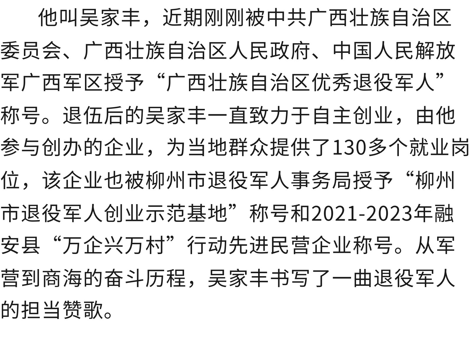 【最美退役軍人】從軍營(yíng)硬漢到創(chuàng)業(yè)先鋒——記廣西優(yōu)秀退役軍人吳家豐 發(fā)布時(shí)間:2025年09月19日 09時(shí)來(lái)源:本站原創(chuàng)瀏覽:77 人次