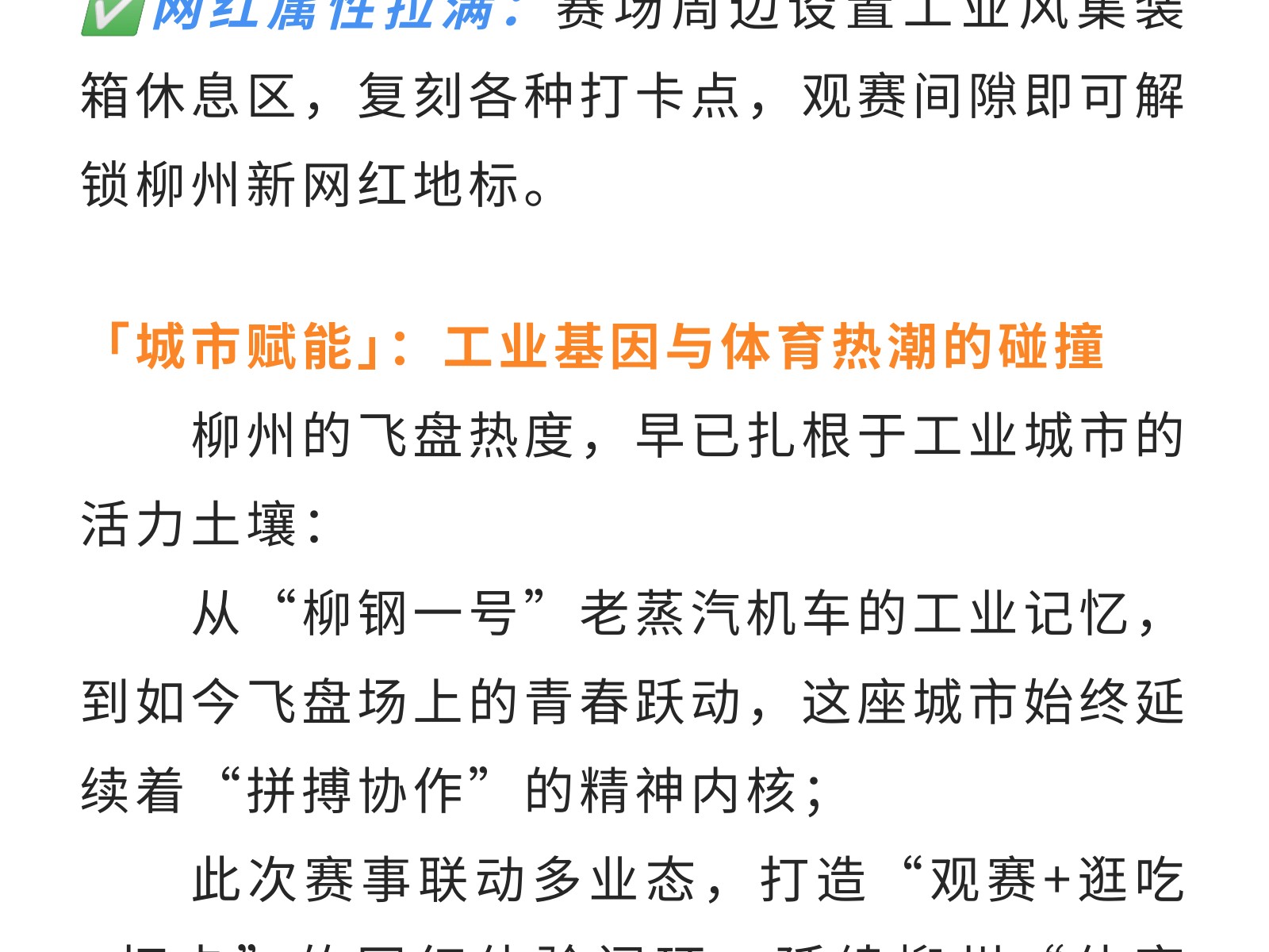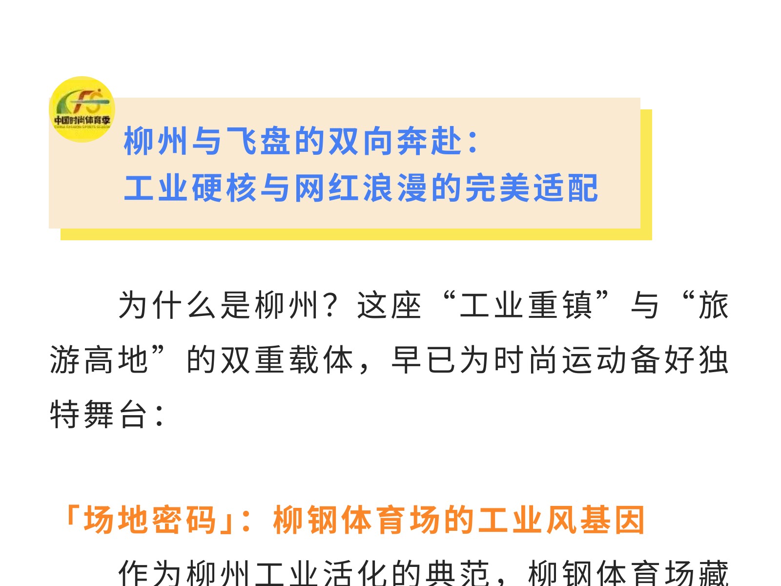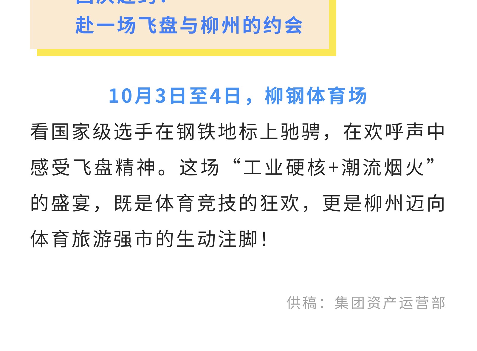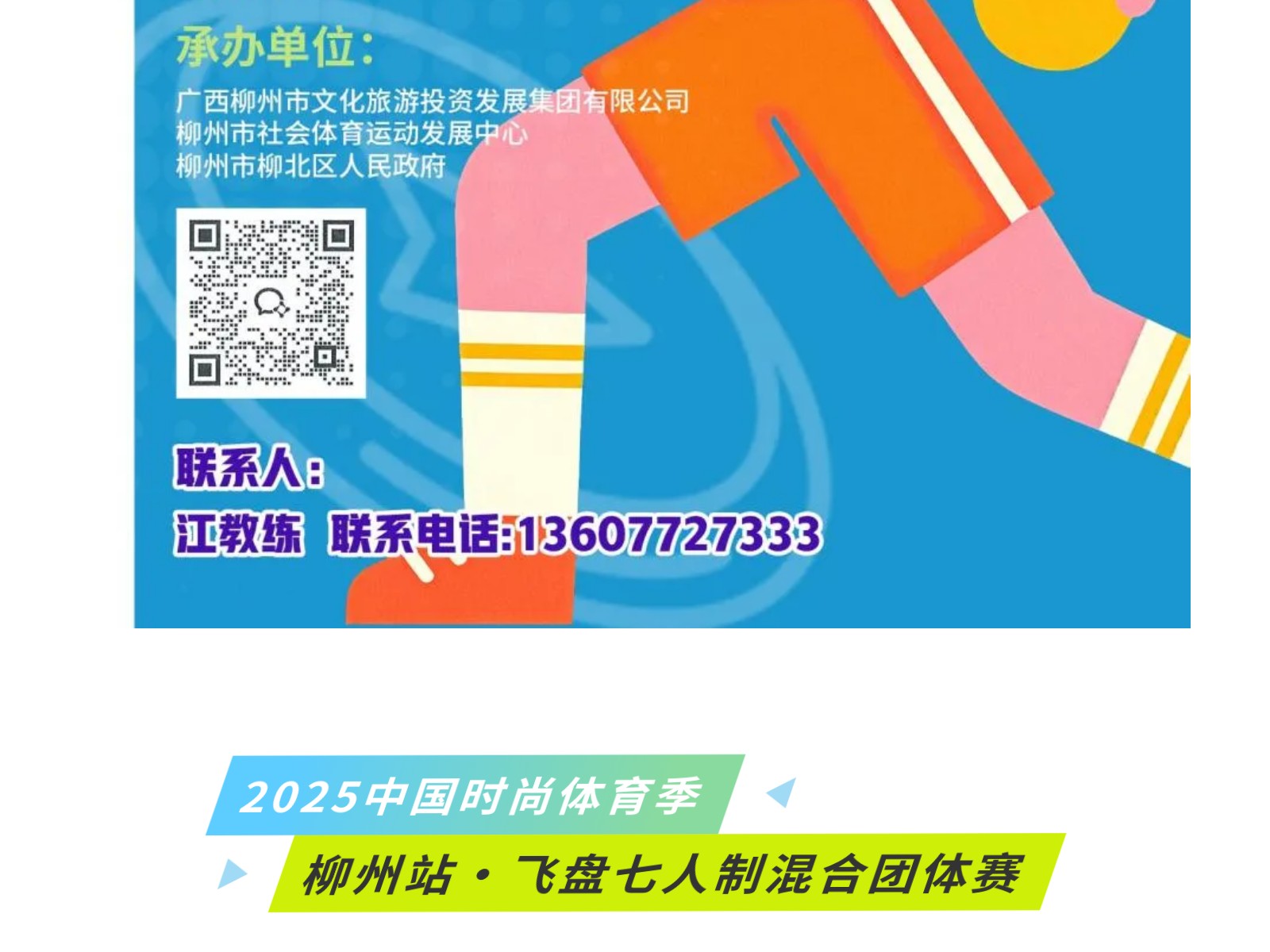 官宣!2025中國(guó)時(shí)尚體育季(柳州站)飛盤邀請(qǐng)賽來(lái)襲!10月3-4日燃情開(kāi)幕! 發(fā)布時(shí)間:2025年09月27日 10時(shí)來(lái)源:本站原創(chuàng)瀏覽:110 人次