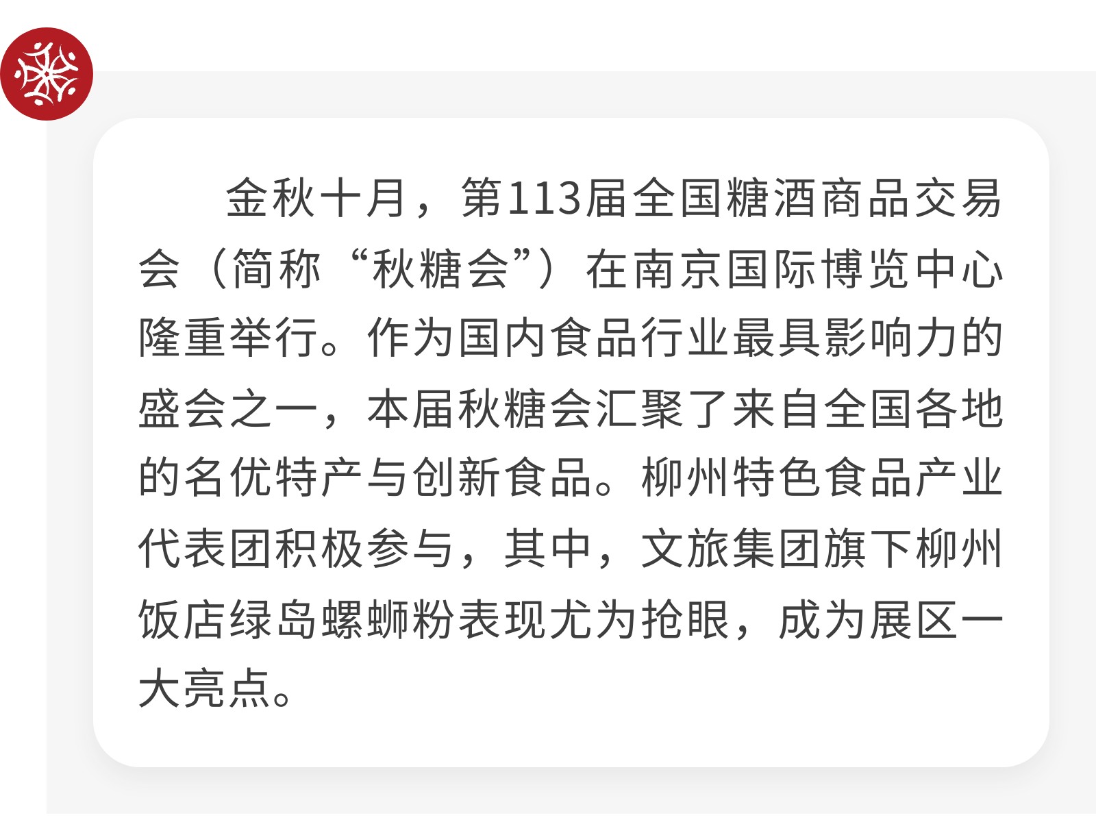 【一碗螺螄粉,香動(dòng)秋糖會(huì)】文旅集團(tuán)柳州飯店綠島螺螄粉用實(shí)力“圈粉” 發(fā)布時(shí)間:2025年10月22日 10時(shí)來(lái)源:本站原創(chuàng)瀏覽:16 人次