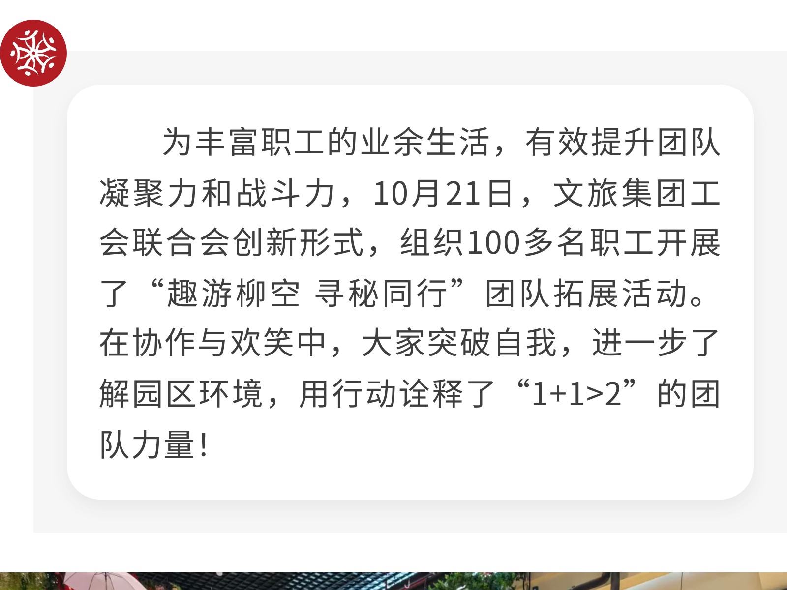 趣游柳空,尋秘同行!文旅集團(tuán)開(kāi)展團(tuán)隊(duì)拓展活動(dòng),玩出滿滿凝聚力 發(fā)布時(shí)間:2025年10月23日 10時(shí)來(lái)源:本站原創(chuàng)瀏覽:52 人次