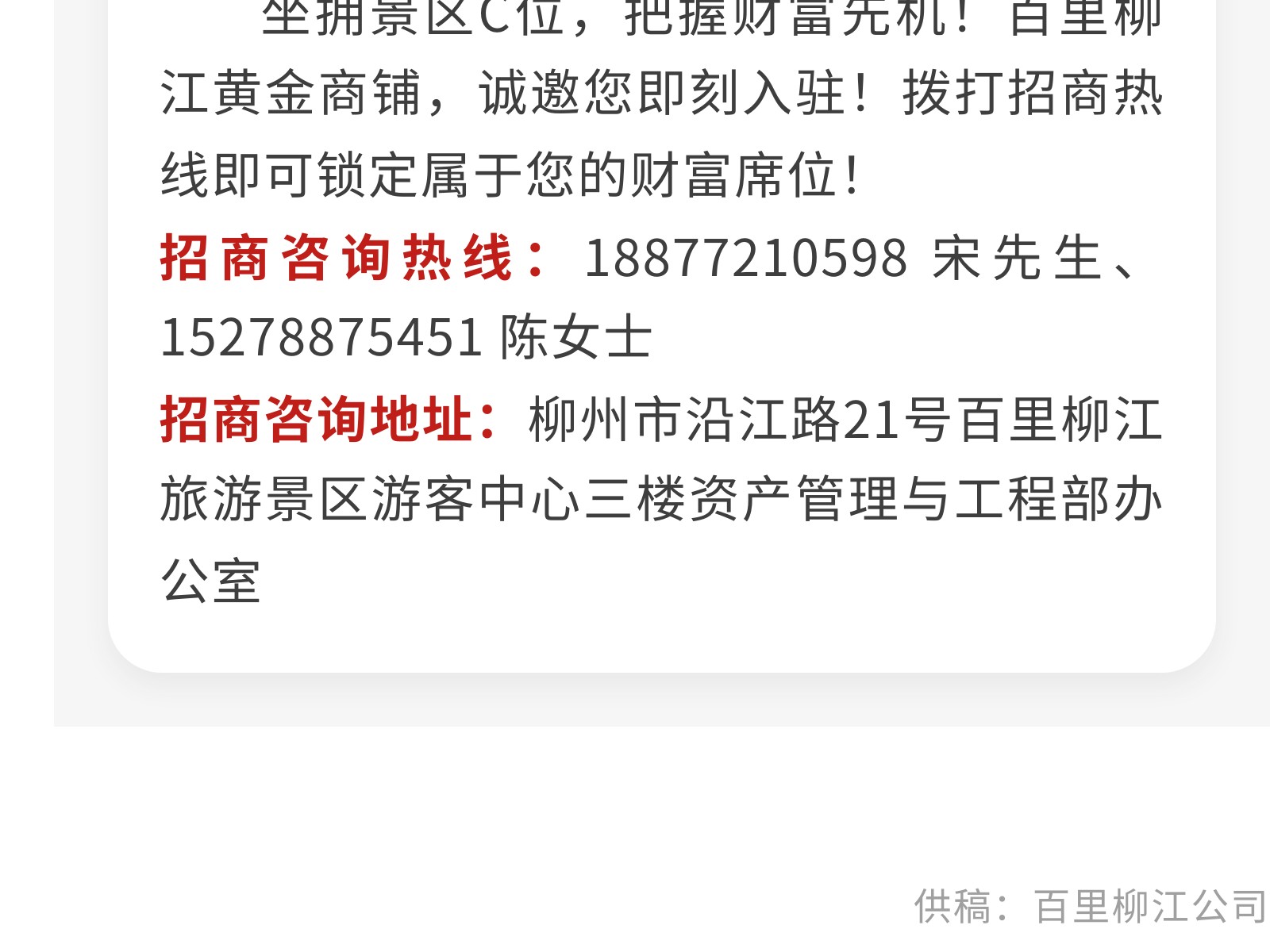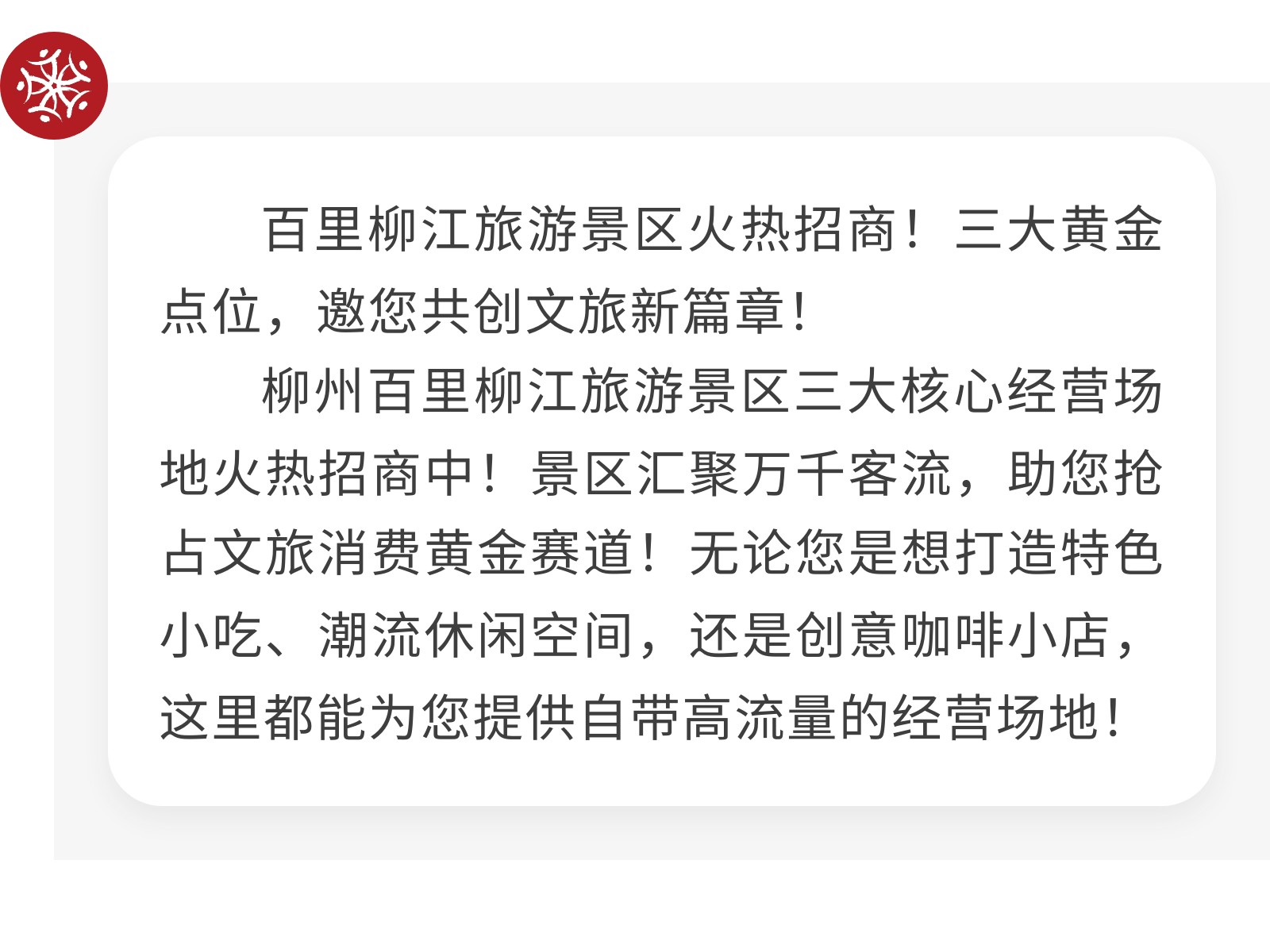 【國企品質(zhì) 誠邀共贏】百里柳江旅游景區(qū)三大黃金點位火熱招商中!邀您共創(chuàng)文旅新篇章! 發(fā)布時間:2025年10月31日 10時來源:本站原創(chuàng)瀏覽:56 人次