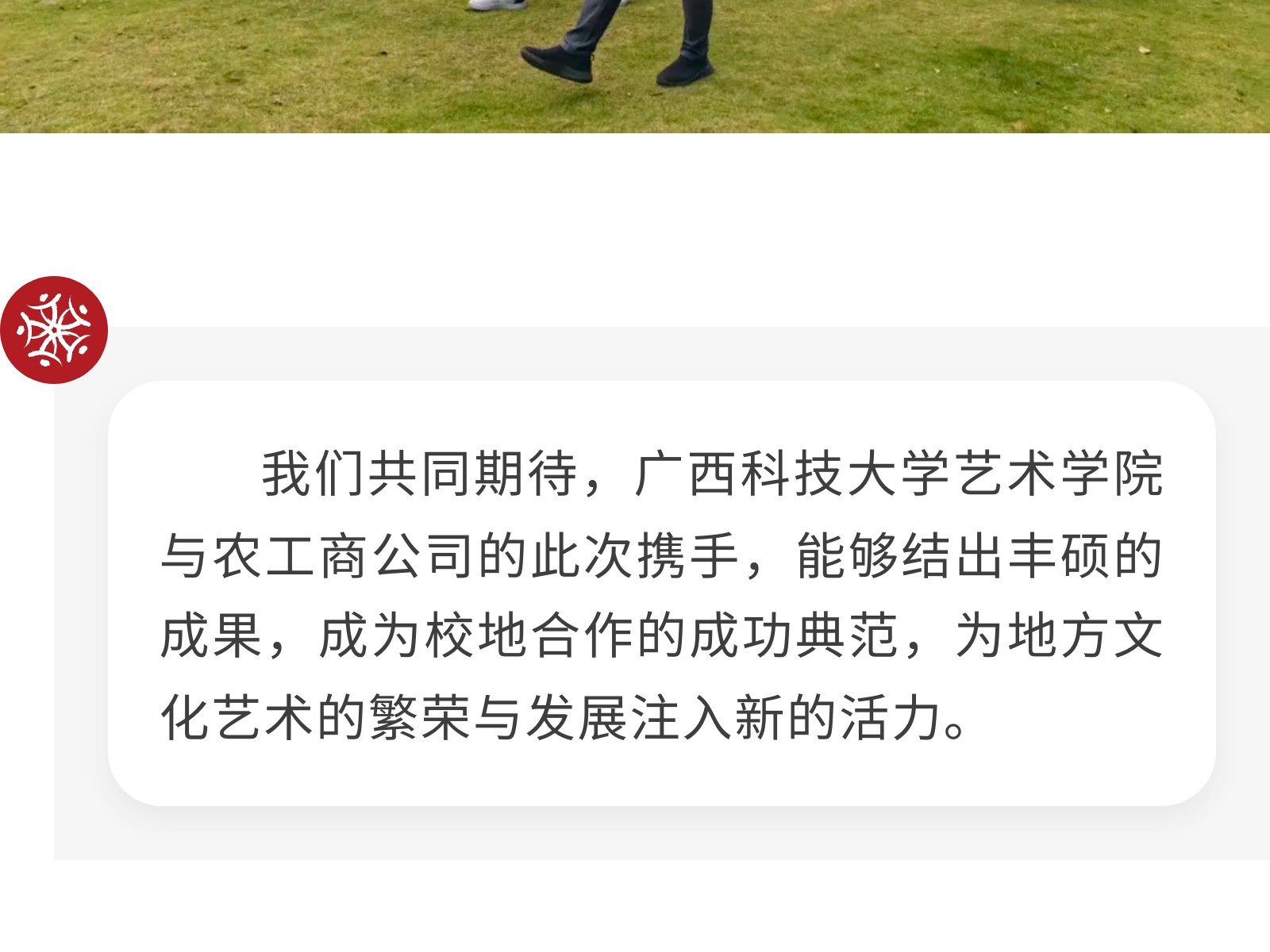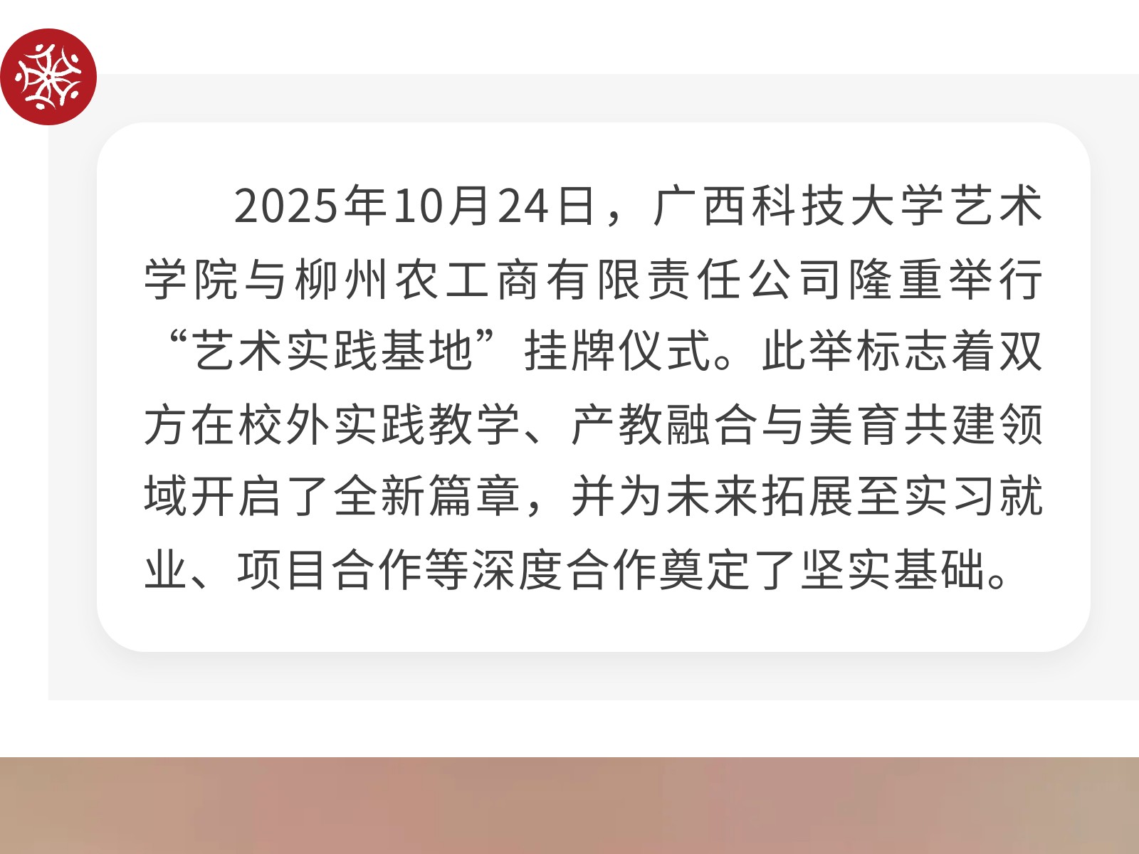 【校企攜手 共育英才】廣西科技大學(xué)藝術(shù)學(xué)院與柳州農(nóng)工商公司正式簽署校企合作協(xié)議 發(fā)布時間:2025年11月02日 10時來源:本站原創(chuàng)瀏覽:69 人次