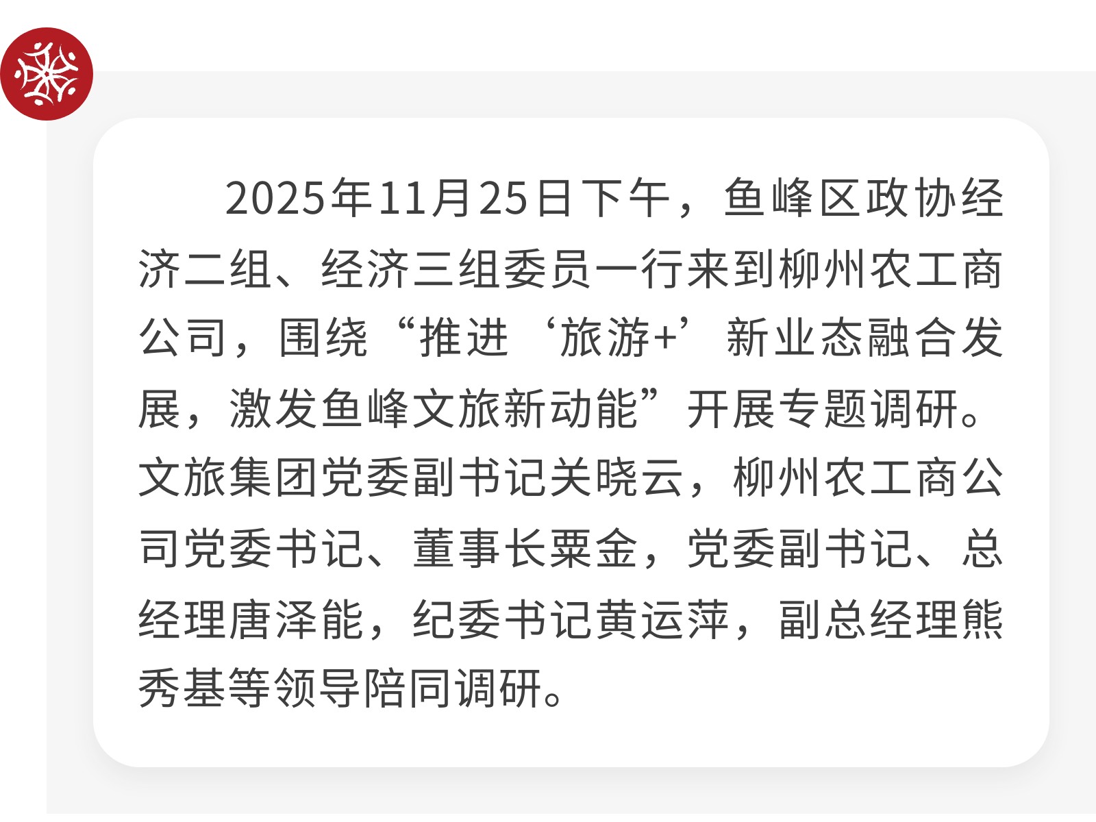 【政協(xié)來“把脈”,文旅添“動(dòng)能”】魚峰區(qū)政協(xié)專題調(diào)研農(nóng)工商公司 發(fā)布時(shí)間:2025年11月28日 09時(shí)來源:本站原創(chuàng)瀏覽:10 人次