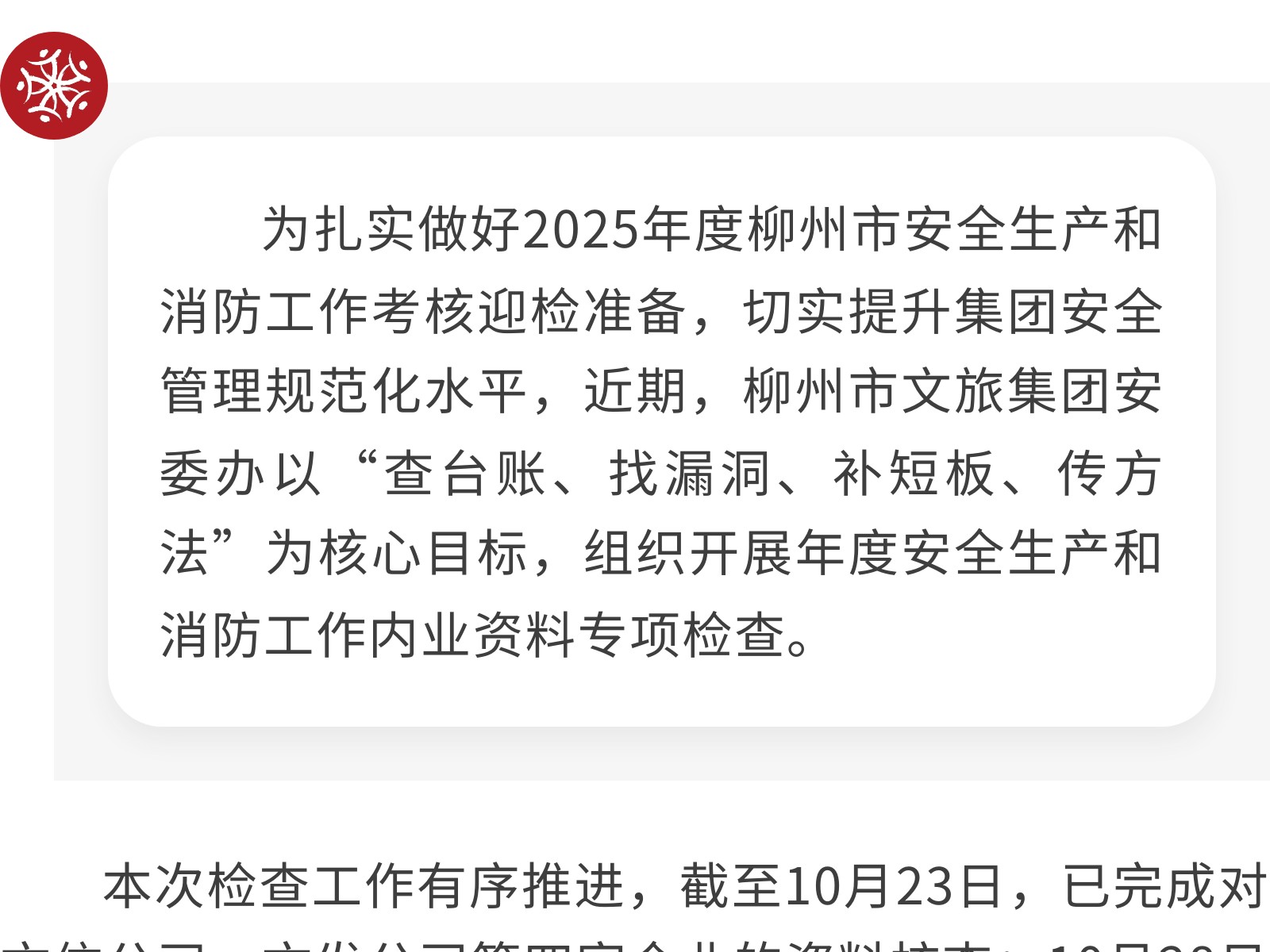 專項(xiàng)檢查安全內(nèi)業(yè)資料 以查促改筑牢安全防線 發(fā)布時(shí)間:2025年12月01日 10時(shí)來源:本站原創(chuàng)瀏覽:9 人次