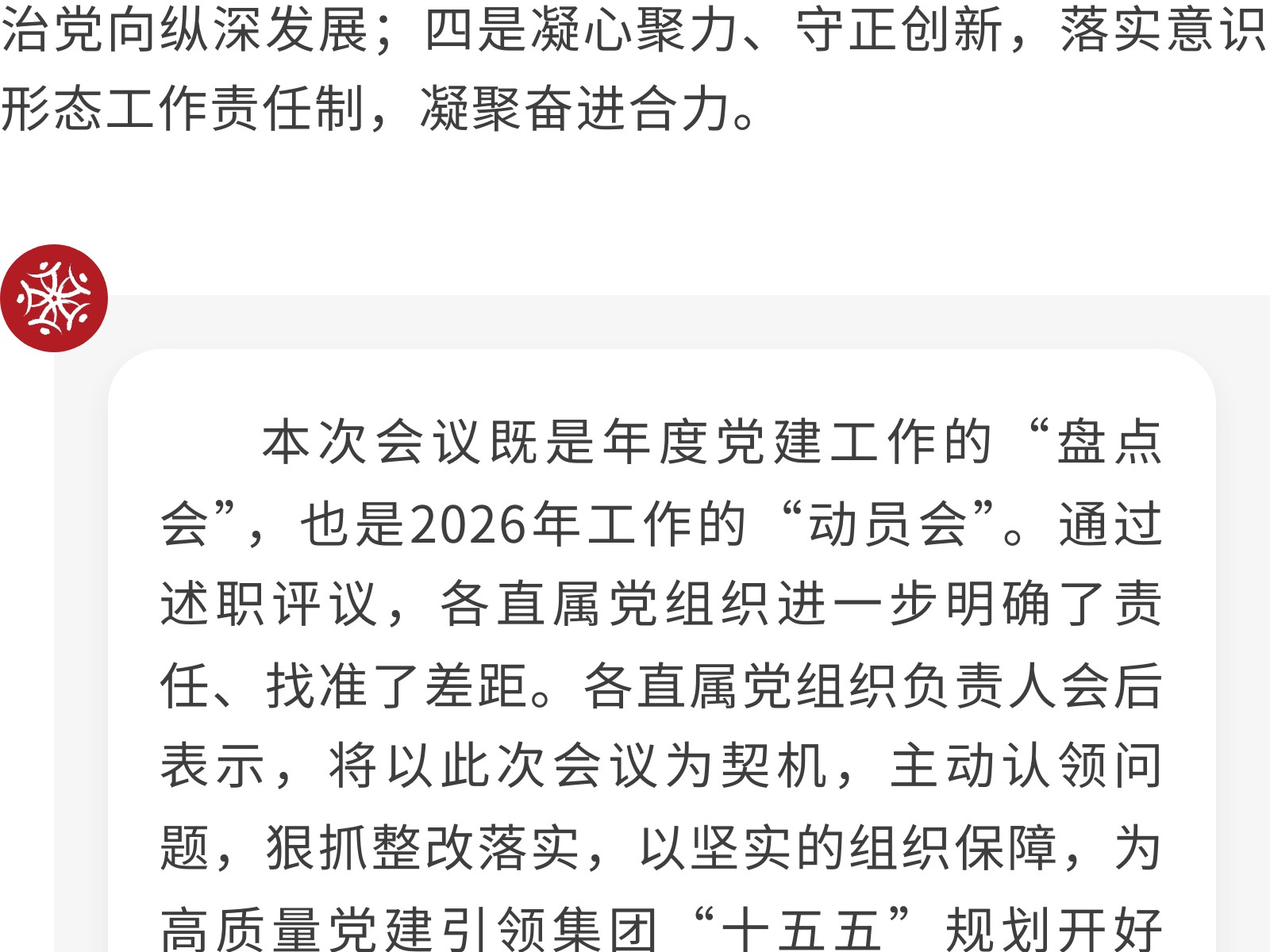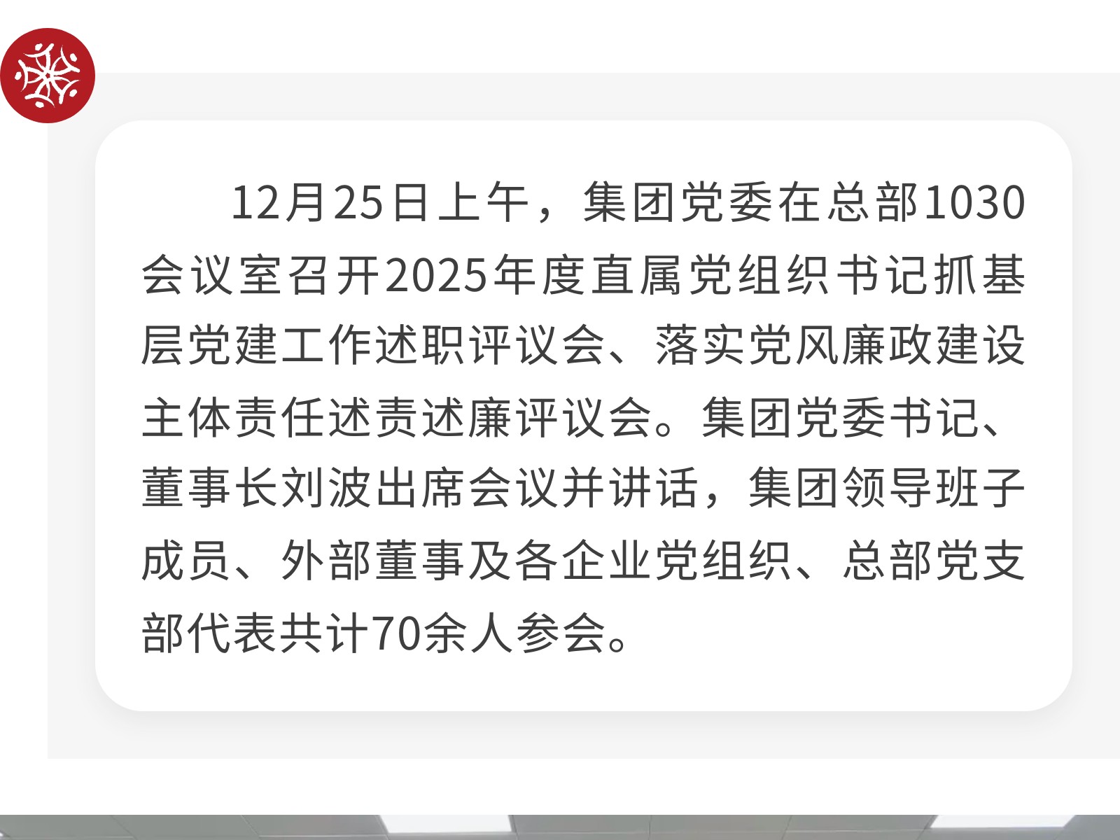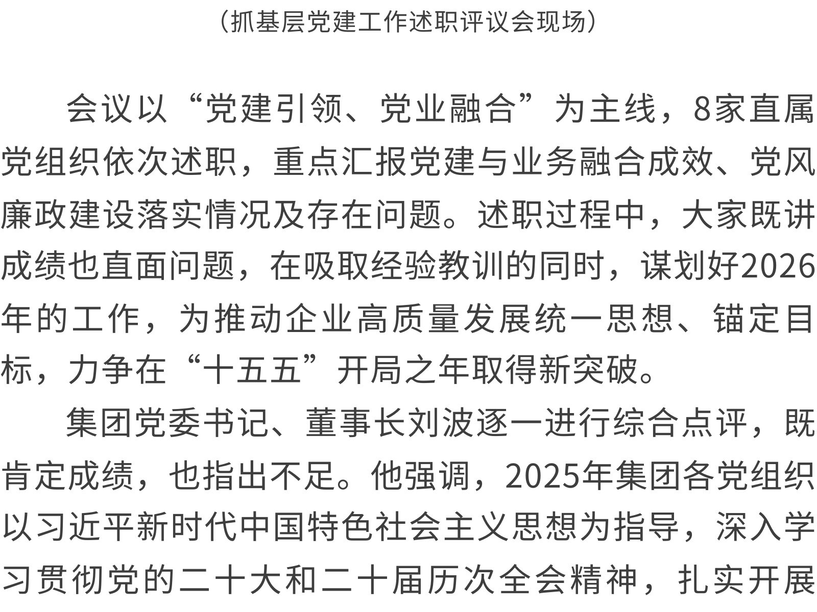 黨建引領(lǐng)聚合力 述職評議促提升——集團(tuán)黨委召開2025年度直屬黨組織書記述職評議會 發(fā)布時間:2025年12月25日 10時來源:本站原創(chuàng)瀏覽:9 人次