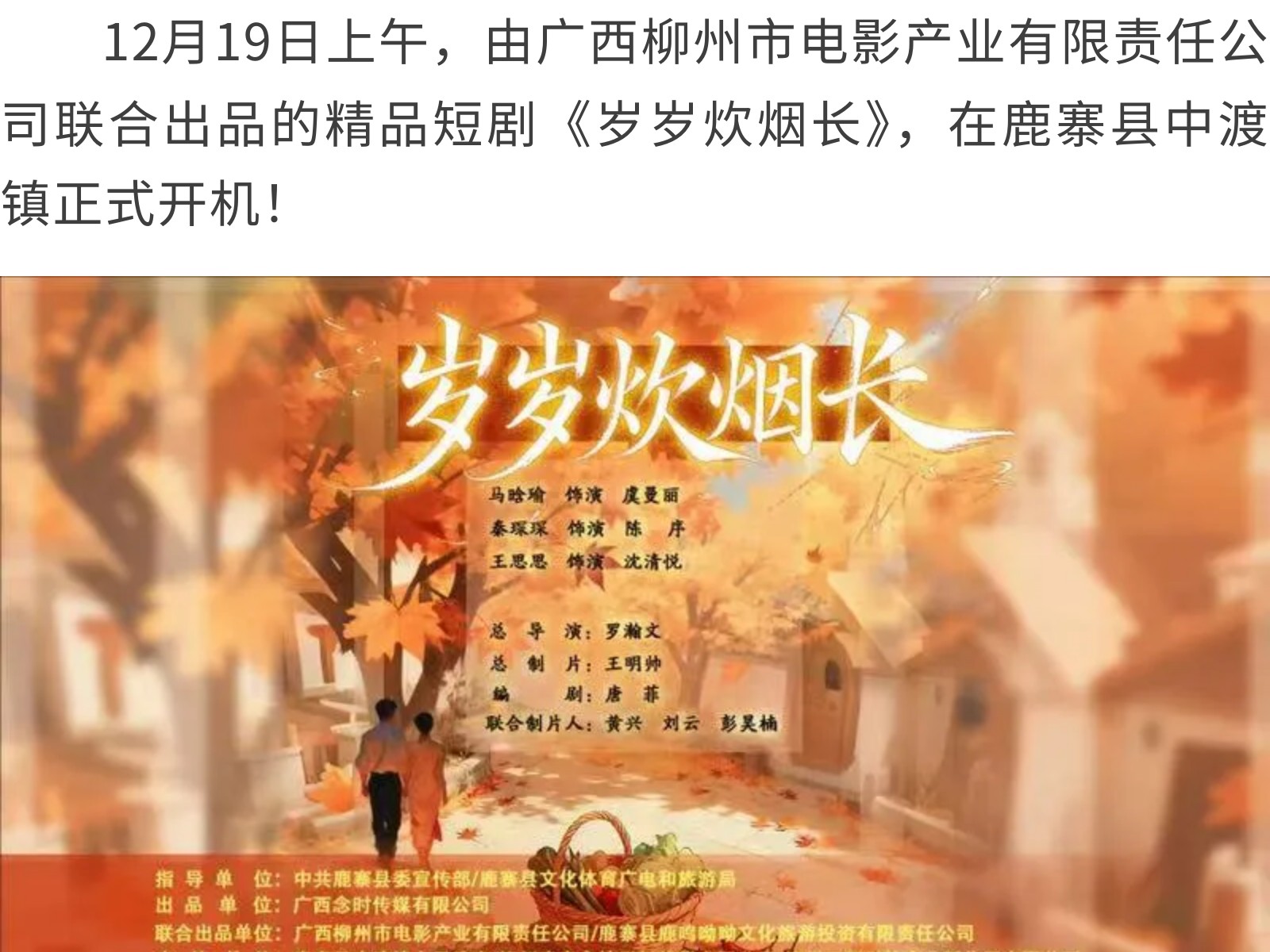 火力全開!精品短劇《歲歲炊煙長》柳州熱拍,文旅融合力作值得期待 發(fā)布時間:2025年12月27日 11時來源:本站原創(chuàng)瀏覽:16 人次