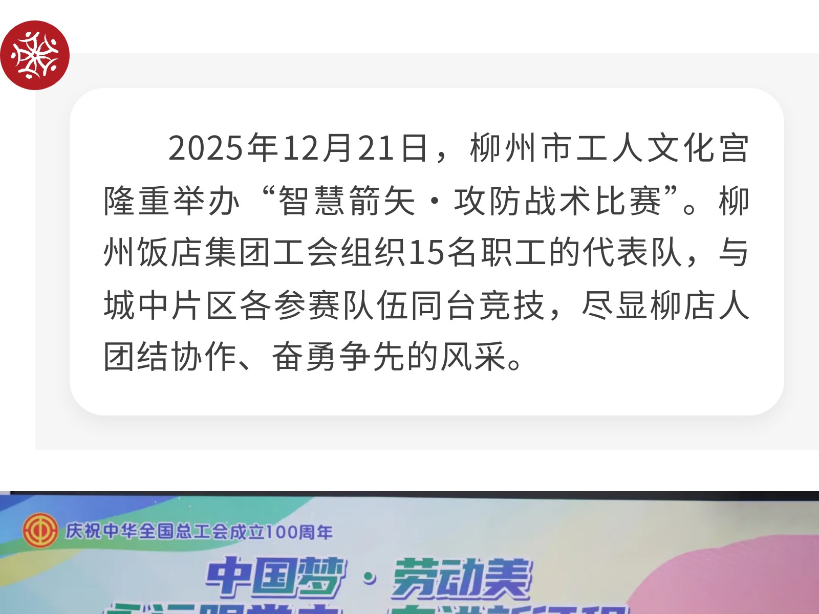 智慧箭矢,誰(shuí)與爭(zhēng)鋒!——柳州飯店集團(tuán)工會(huì)戰(zhàn)隊(duì)閃耀城中職工文化活動(dòng)賽場(chǎng) 發(fā)布時(shí)間:2025年12月30日 11時(shí)來(lái)源:本站原創(chuàng)瀏覽:16 人次